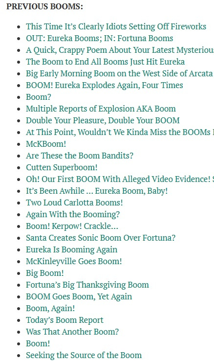 You probably remember all those loud booms we used to hear in eureka and Fortuna especially. They ran from 2012 and then mysteriously went away in 2017. News reporters, law enforcement , those that heard the booms never could figure out what was responsible for the deep earth rumbling sort of boom sound. The possible explanations were never believable. It wasn't mortars or fireworks. And it wasn't usually those pg and e transformer boxes either.